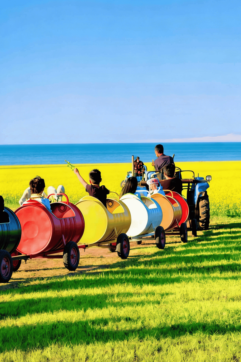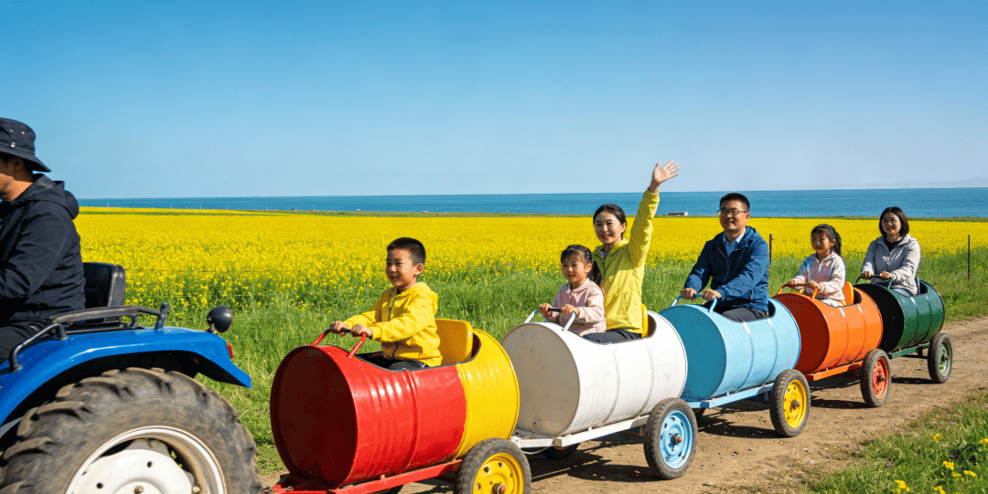 乘坐今年特别升级打造的、青海首个【湖畔草原油菜花海·油桶小火车】,小火车穿梭在草原油菜花海之中,沿途可欣赏成片花海与湖畔风光。