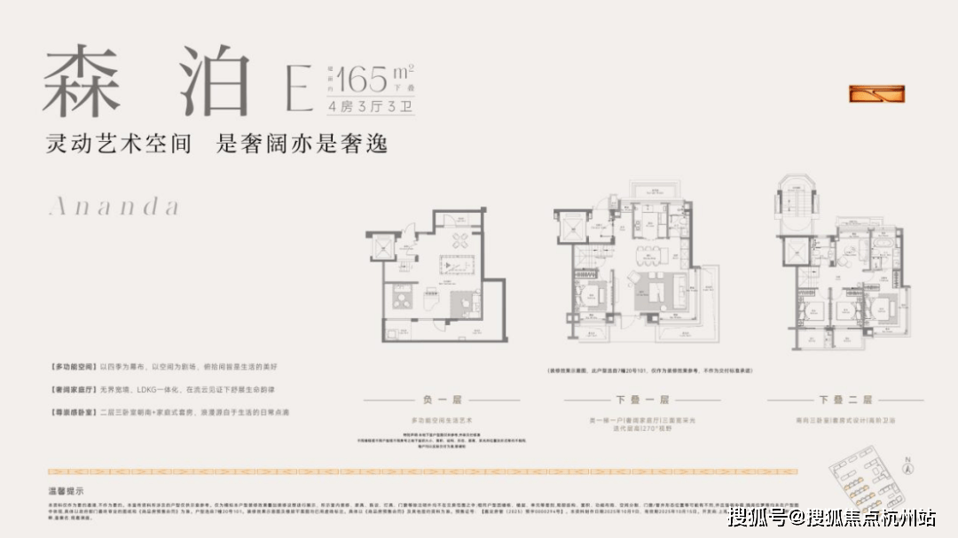 建面约165㎡下叠预计使用率最高约148%、地下室三面采光、LDKG双入户流线、南北通透主卧套房。