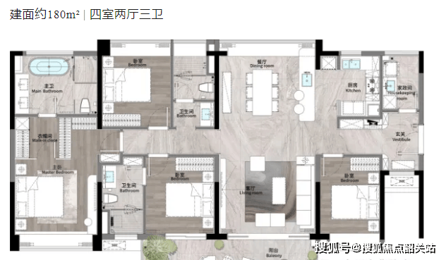 最后是建面约180平方米的四室两厅三卫户型,这是整个项目中的旗舰产品。约17.6米的四开间设计,拉伸了生活的视角,远眺城市繁华,近观园林美景,真正实现了“墅级”居住体验。独立家政间的设置,实现了一站式洗涤动线,让生活井井有条,彻底解放了主人的双手。三卫设计更是升级了生活品质,无论家庭成员如何增长,都能从容应对,互不干扰。主卧双洗手台的设计,增添了生活的仪式感,让夫妻二人的洗漱时光变得更加亲密与温馨。