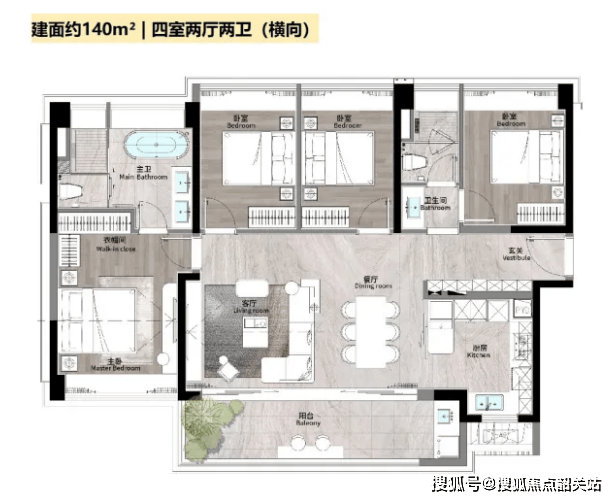其次是建面约140平方米的四室两厅两卫户型,分为横向与纵向两种布局。横向布局的140平米户型被誉为“纯正大四房”,坚决拒绝3+1”的伪四房概念,确保了每个房间的独立性与舒适性。三面采光的設計,让阳光能够全天候洒满室内,营造出温暖明亮的居住氛围。约7.7米的超长跑道式阳台,不仅是晾晒衣物的场所,更是一个小型的空中花园,业主可以在这里打高尔夫、品茶赏景,尽情享受户外生活的乐趣。主卧套房面积约34.7平方米,配备了独立卫浴、衣帽间及观景飘窗,堪比五星级酒店的行政套房,为二人世界营造了极致的浪漫与私密空间。