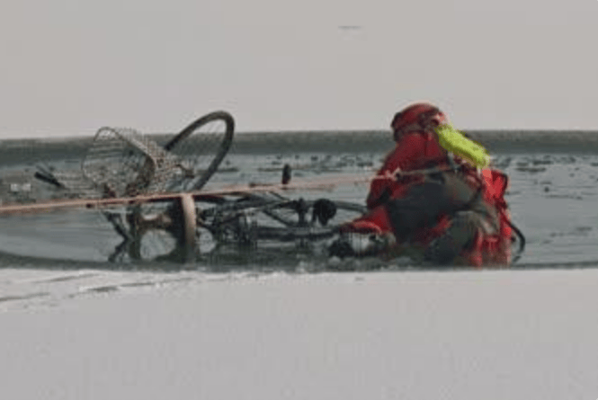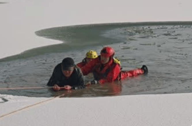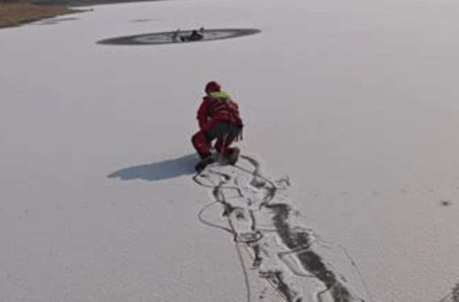 12时56分,救援人员抵达现场,发现一名老年男子因骑着自行车横穿冰面,行至水域中央时冰面破裂,连人带车落水。所幸老人反应迅速,双手紧抓冰缘,以俯卧姿势勉强支撑。然而,当时气温已达零下,老人浑身发抖、嘴唇发紫,体力明显不支。其周围冰面不断传来“咔嚓”碎裂声,裂纹持续扩散,随时可能发生二次坍塌。